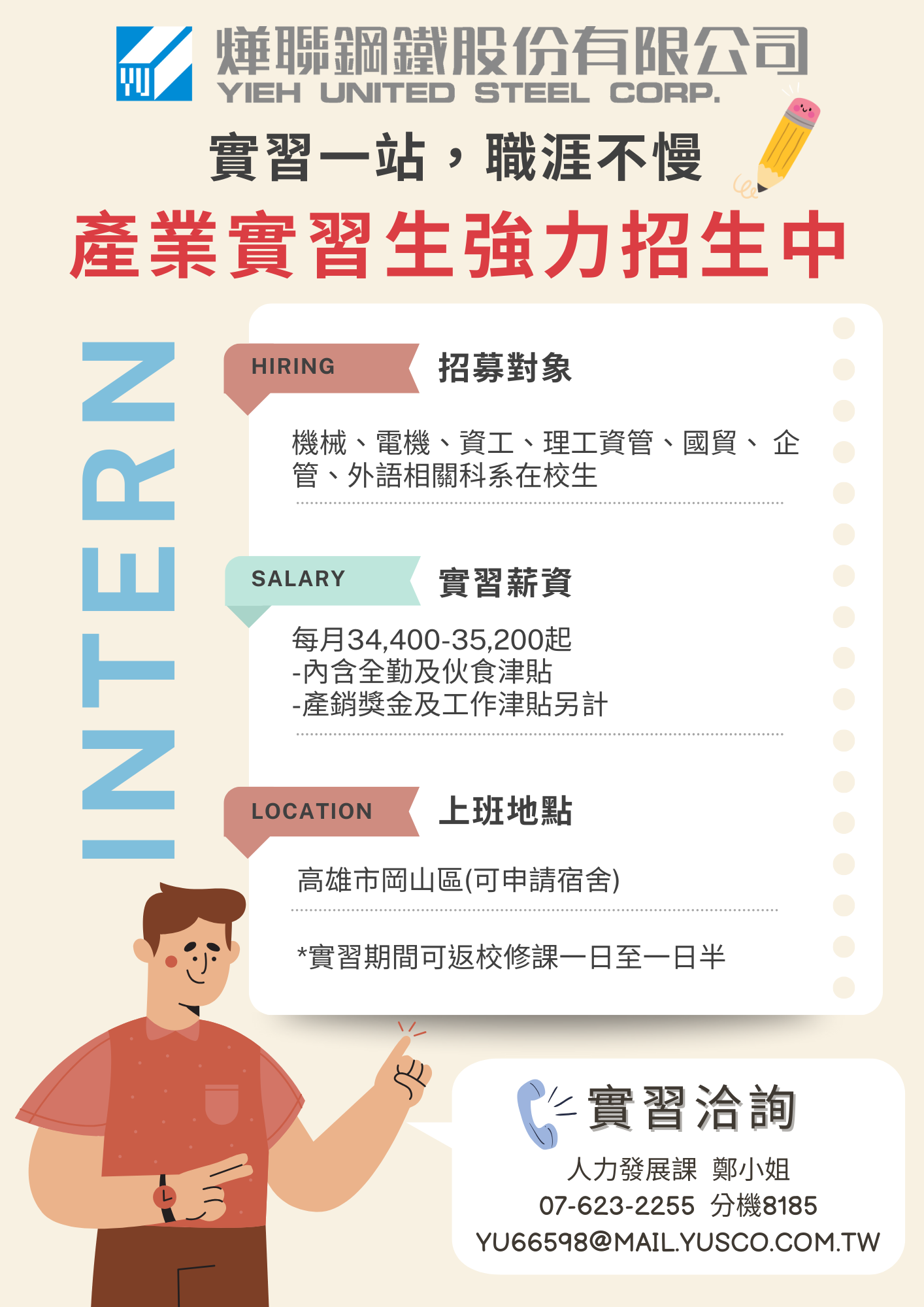 若欲參加實習者,需符合下列條件 : 114學年度第2學期前(含)已修畢所有必修學分數,且需先經過本系實習審查會議討論並同意後,始得參加實習,報名自即日起至115年4月17日止。請同學來系辦檢核畢業學分數,並向系辦詢問加入Line實習群組。